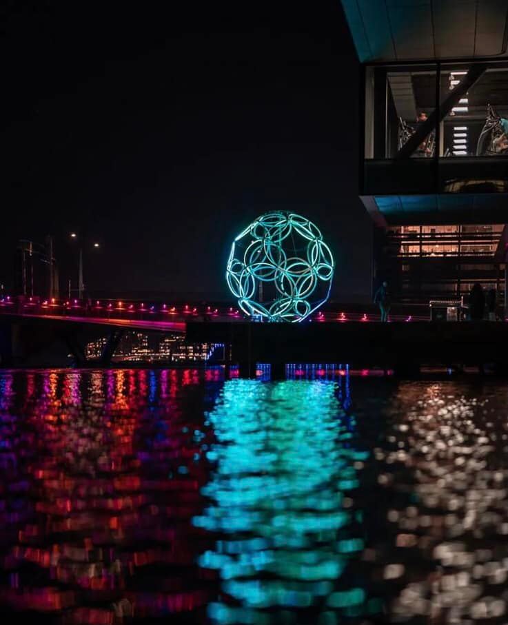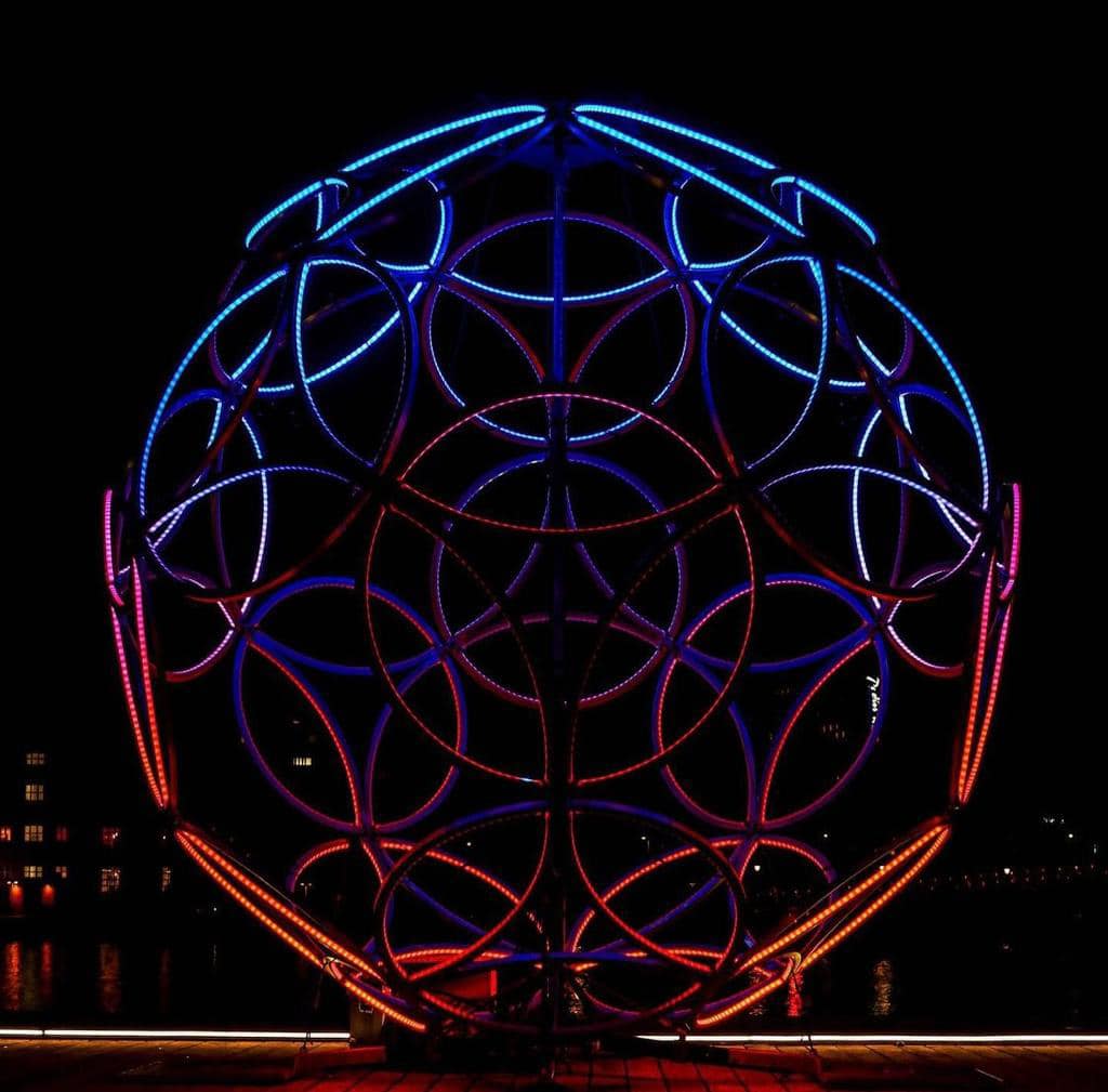 The installation is a 4 meters diameter simmetrical Icosahedron made of an aluminium