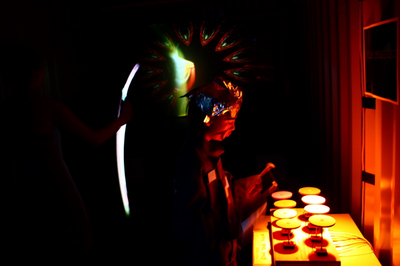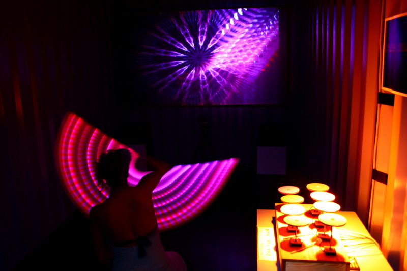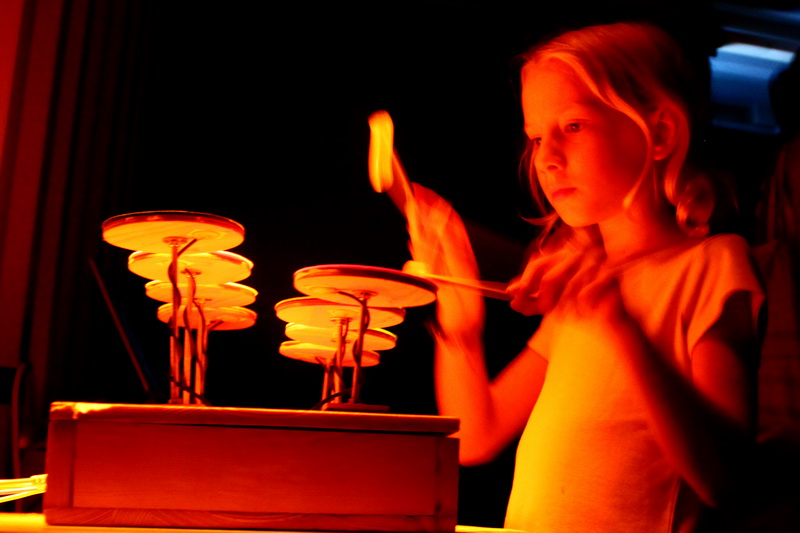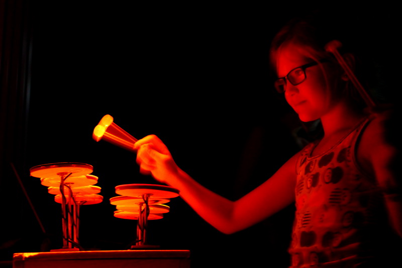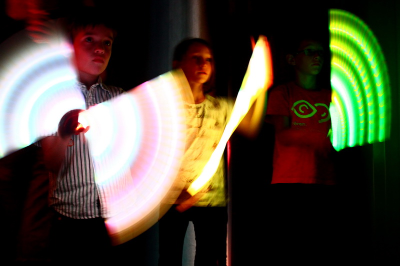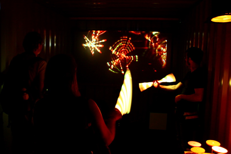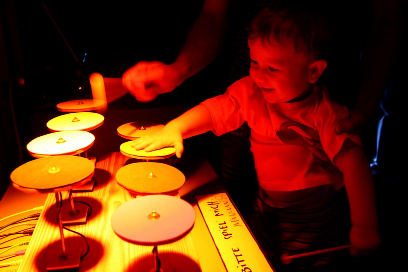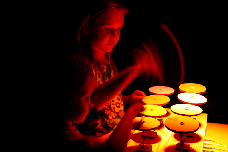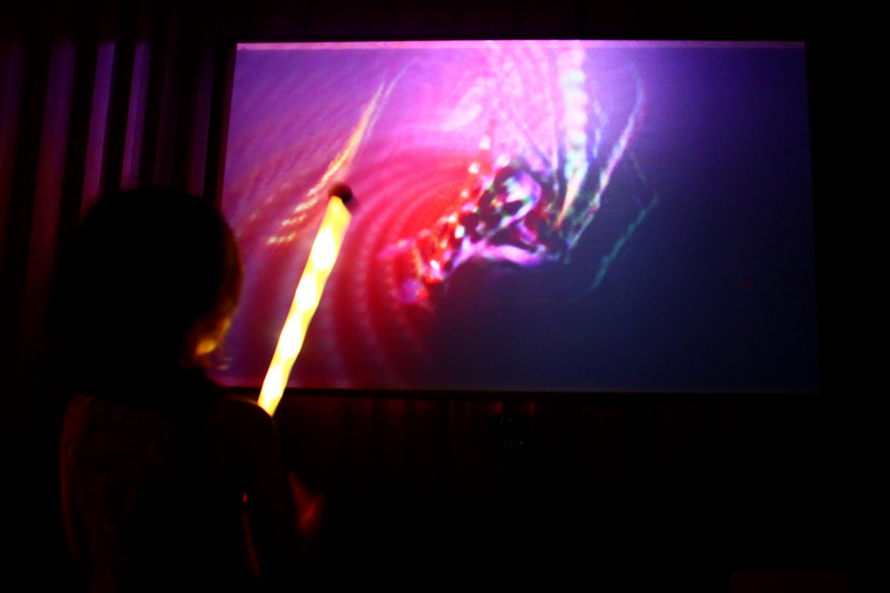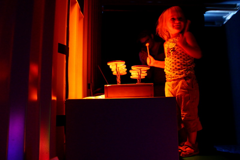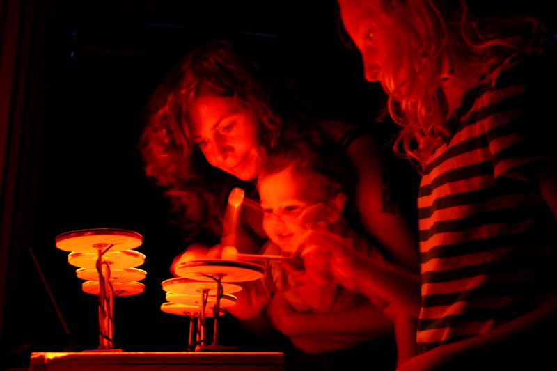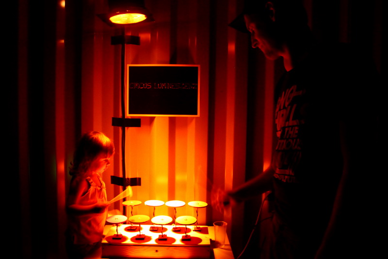 Circus Lumineszenz Playground is an Immersive Interactive Multimedia Installation aimed at young audiences and families, where they are invited to create visuals with different light objects. A video camera is monitoring the action and sending the information to a computer, which with specific software of our design modifies the images that are at the same time projected in a screen, creating a beautiful world of Light and Colour. We also provide home-made electronic musical instruments, such as the Electronic Marimba, the Photophono and the little Laser Harp, which are connected to the computer and trigger magical electronic sounds and effects.