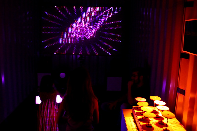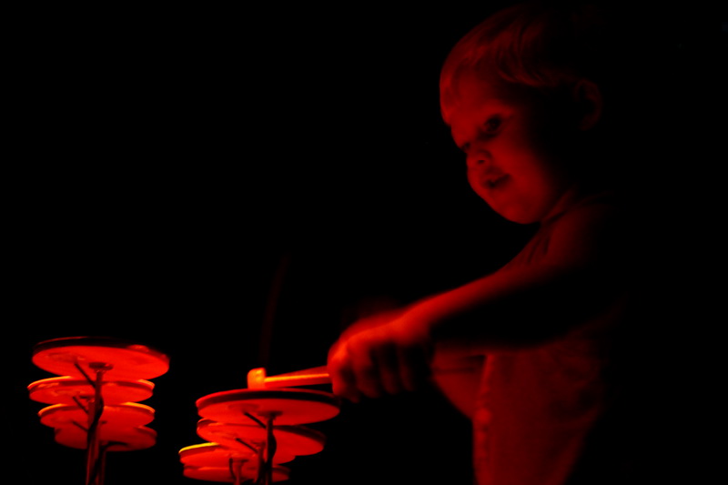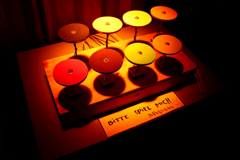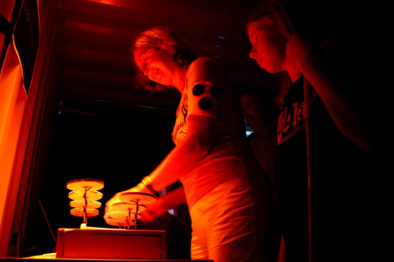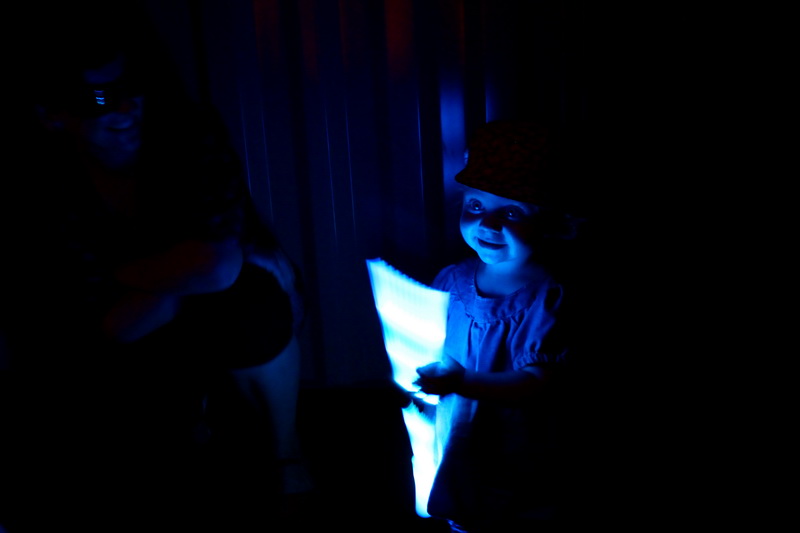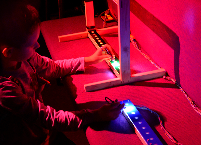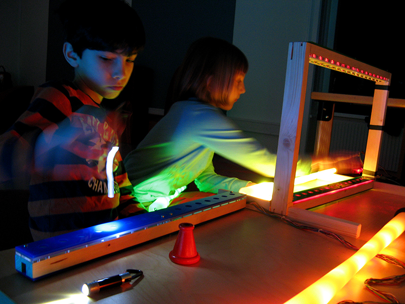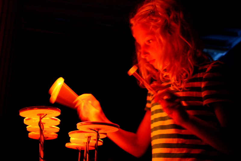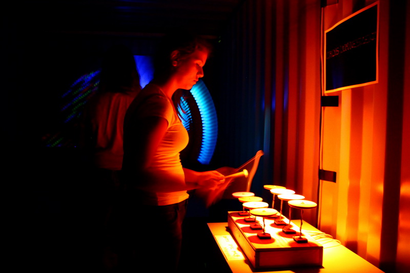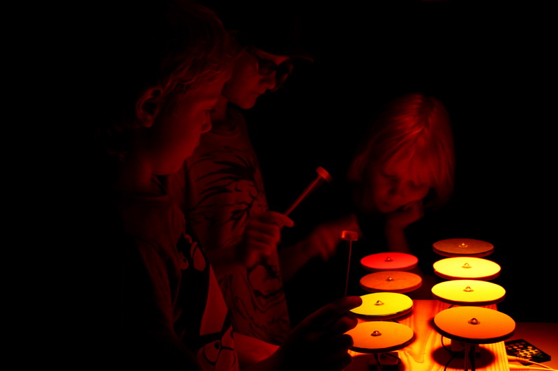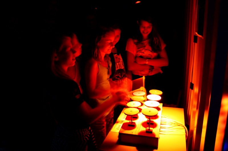 Circus Lumineszenz Playground is an Immersive Interactive Multimedia Installation aimed at young audiences and families, where they are invited to create visuals with different light objects. A video camera is monitoring the action and sending the information to a computer, which with specific software of our design modifies the images that are at the same time projected in a screen, creating a beautiful world of Light and Colour. We also provide home-made electronic musical instruments, such as the Electronic Marimba, the Photophono and the little Laser Harp, which are connected to the computer and trigger magical electronic sounds and effects.