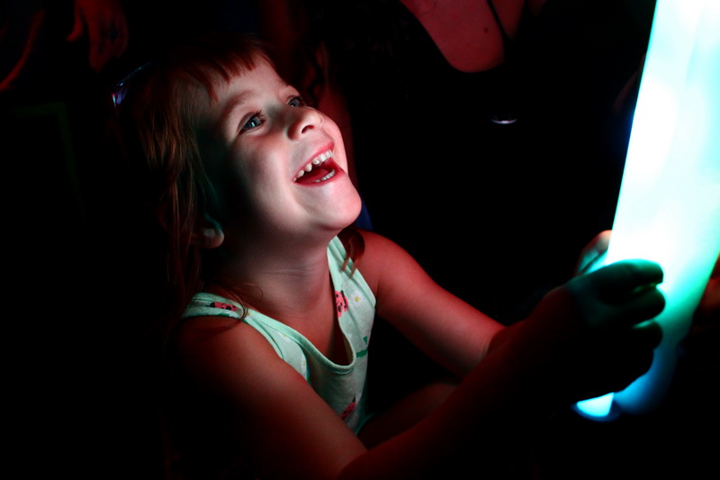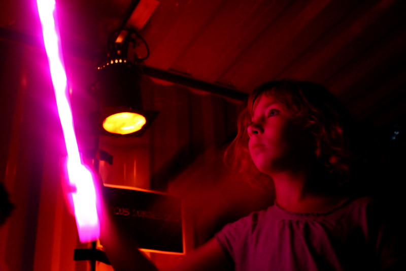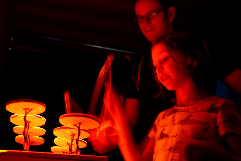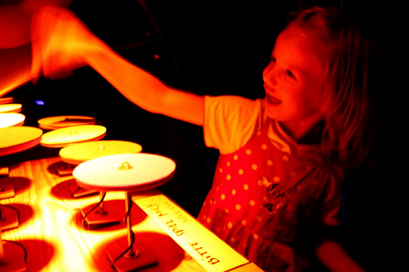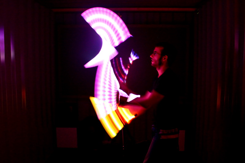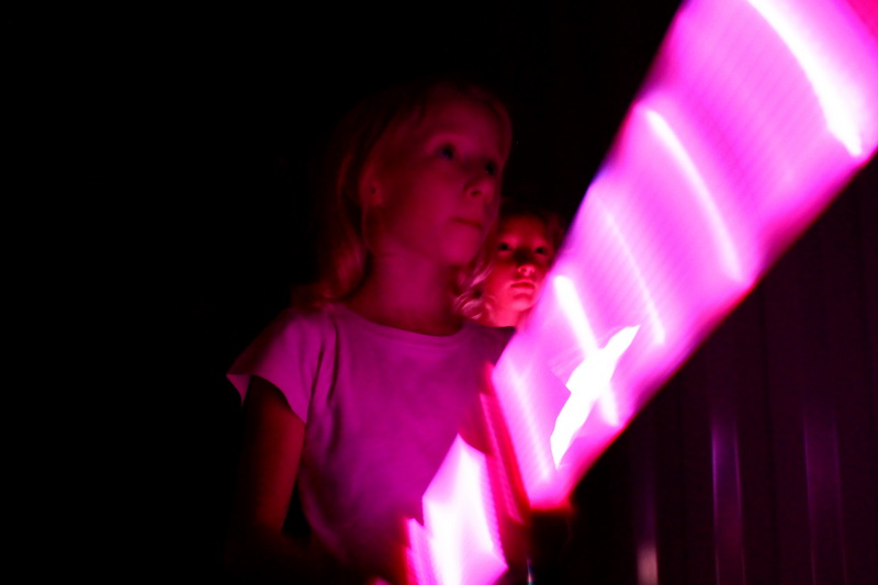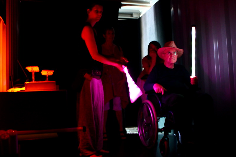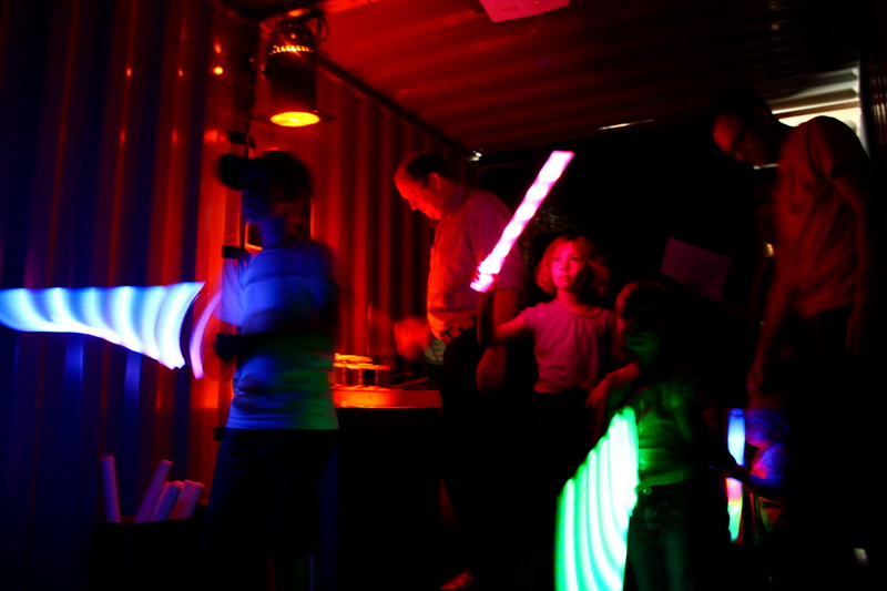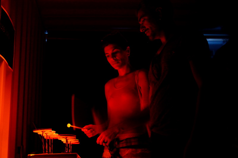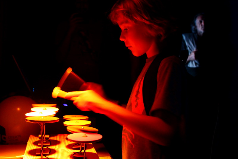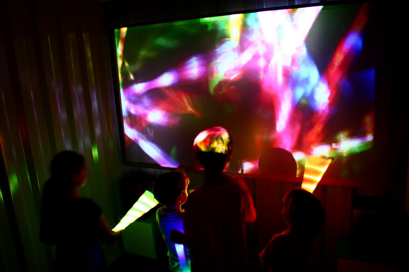 Circus Lumineszenz Playground is an Immersive Interactive Multimedia Installation aimed at young audiences and families, where they are invited to create visuals with different light objects. A video camera is monitoring the action and sending the information to a computer, which with specific software of our design modifies the images that are at the same time projected in a screen, creating a beautiful world of Light and Colour. We also provide home-made electronic musical instruments, such as the Electronic Marimba, the Photophono and the little Laser Harp, which are connected to the computer and trigger magical electronic sounds and effects.