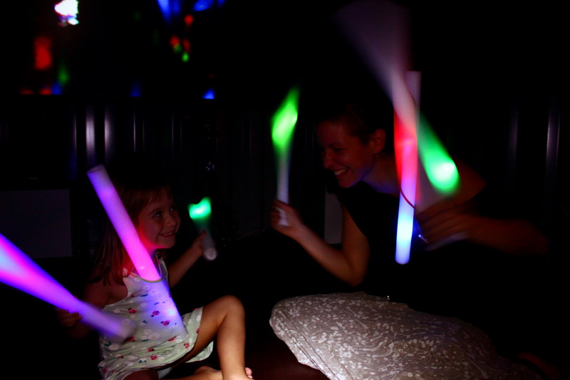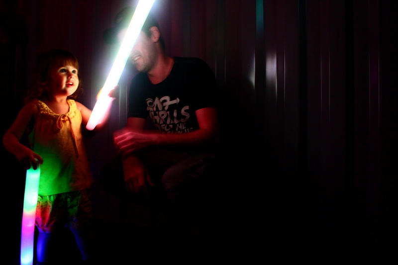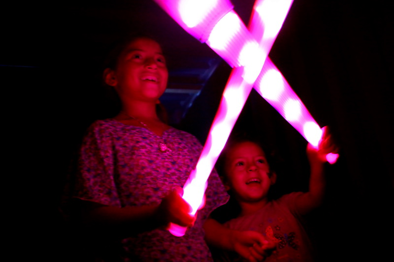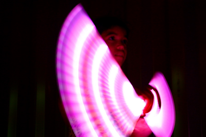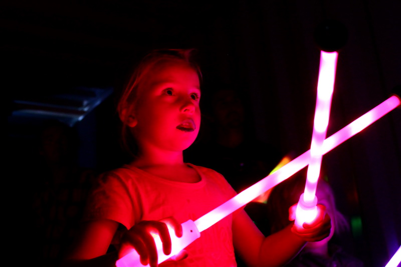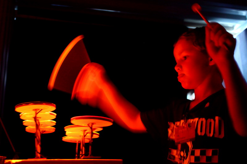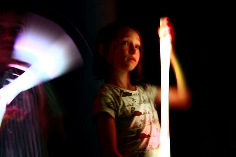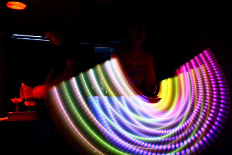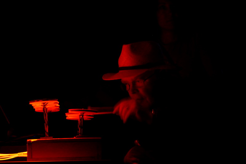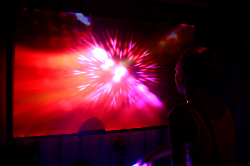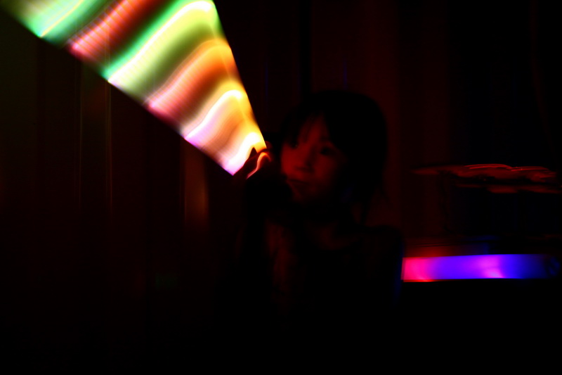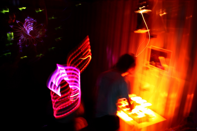Circus Lumineszenz Playground is an Immersive Interactive Multimedia Installation aimed at young audiences and families, where they are invited to create visuals with different light objects. A video camera is monitoring the action and sending the information to a computer, which with specific software of our design modifies the images that are at the same time projected in a screen, creating a beautiful world of Light and Colour. We also provide home-made electronic musical instruments, such as the Electronic Marimba, the Photophono and the little Laser Harp, which are connected to the computer and trigger magical electronic sounds and effects.